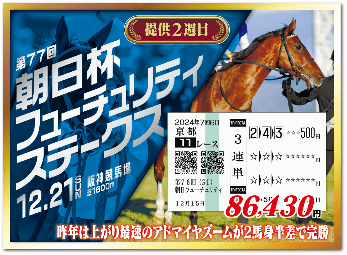阪神ジュベナイルF、朝日杯フューチュリティSの他、2歳戦を中心に毎週的中を記録しております。