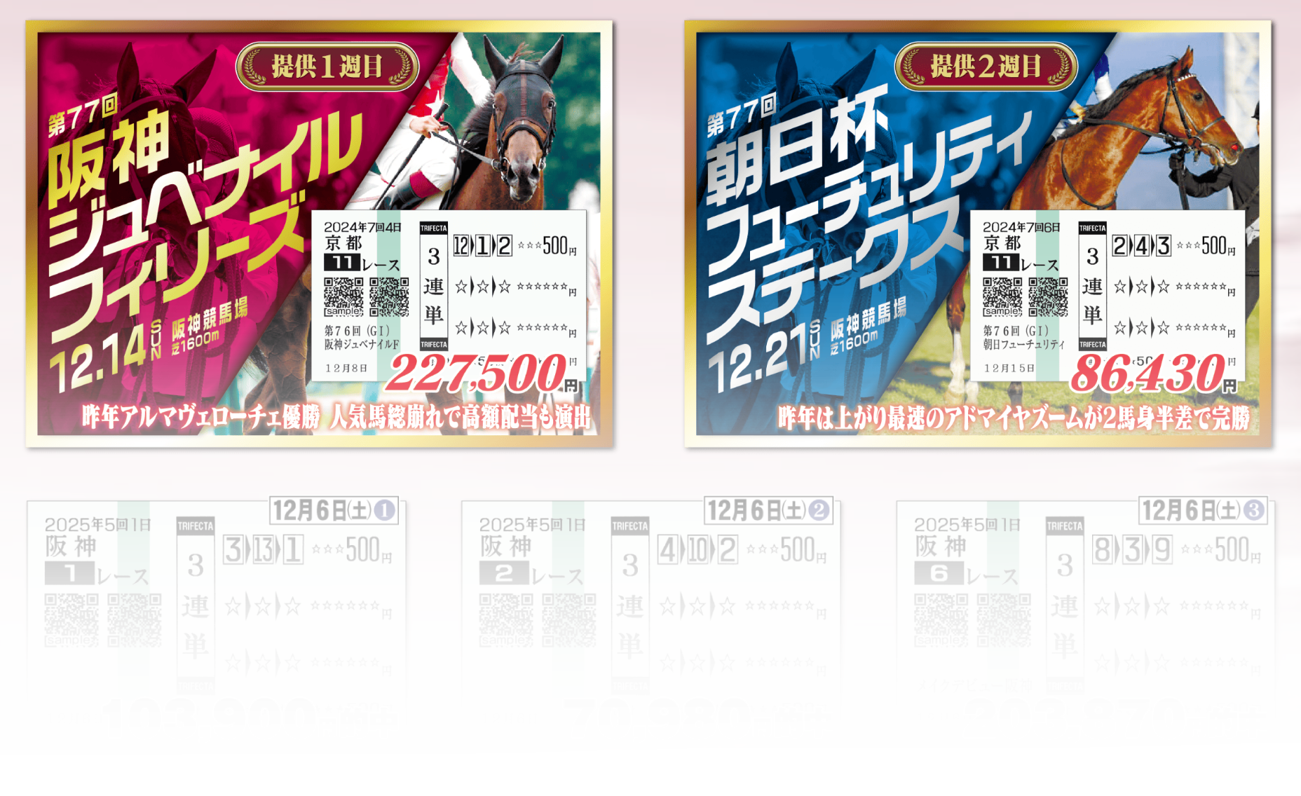 1年の約半分を2歳戦限定、その他の期間は3歳戦を中心に情報をご用意し、他社との明確な差別化を図ります。競馬ファンの皆様、厩舎関係者の皆様、馬主の皆様のお力添えの下、北海道軽種馬生産者一丸で日に新たに的中をお届けします。