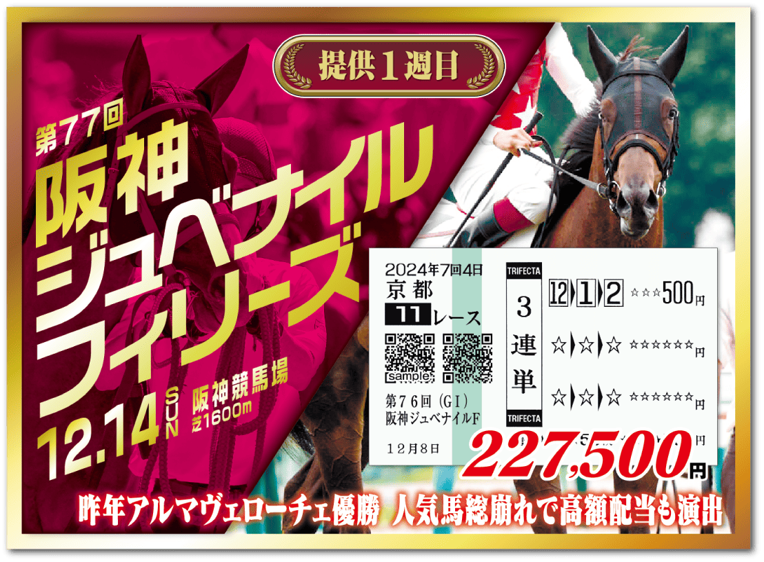今回の募集にて、初日に馬券をお届けする2歳女王決定戦阪神ジュベナイルFは、昨年の22万馬券を含め直近4年間で10万馬券超えの払戻が3回。しかも今年は、フィロステファニ、アランカール、イクシードといった素質馬に加え、有力馬フェスティバルヒルまで骨折で無念の離脱。個人の予想では難しい大混戦必至。私どもは同レースで100万円超えの払戻を見込んでいます。